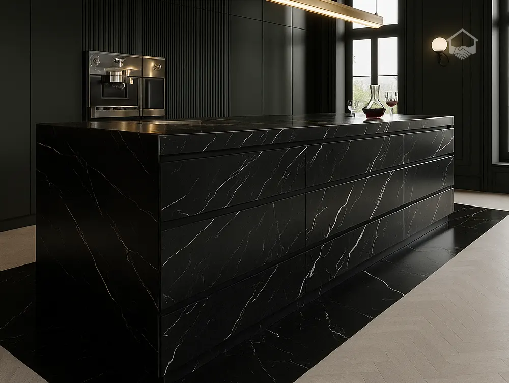 - Mutfak tezgahları (Countertop): Siyah zemin üzerine ince damarlar, mutfağa sofistike bir hava katar.