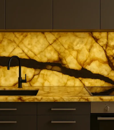 Onyx mutfak yüzeyleri hem modern hem klasik projelerde şıklık ve prestij sağlar.