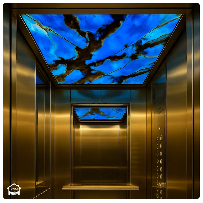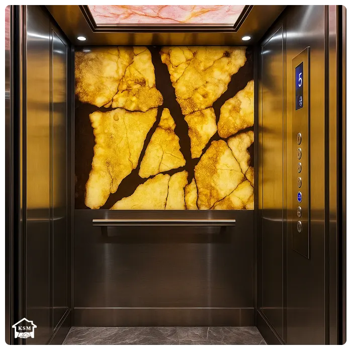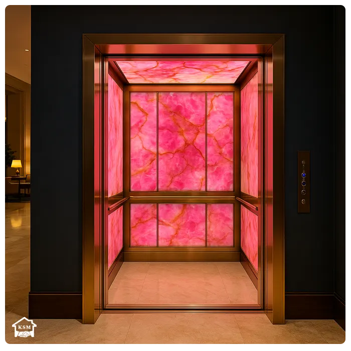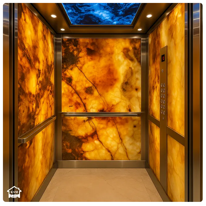 Asansör kabininiz için renk, damar yönü ve ışık tasarımını belirleyin. KSMONYX, İran menşeli doğal taşlarla premium çözümler sunar.